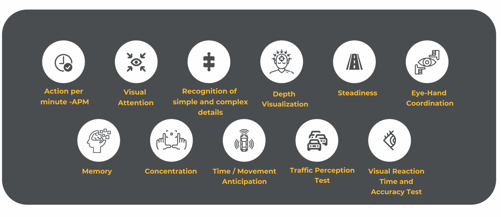 The Performance Test measures 11  key skills essential for safe driving, including reaction speed, visual attention, detail recognition, depth perception, steadinesseye-hand coordination, memory, concentration, motion anticipation, traffic perception, and visual reaction time and accuracy.